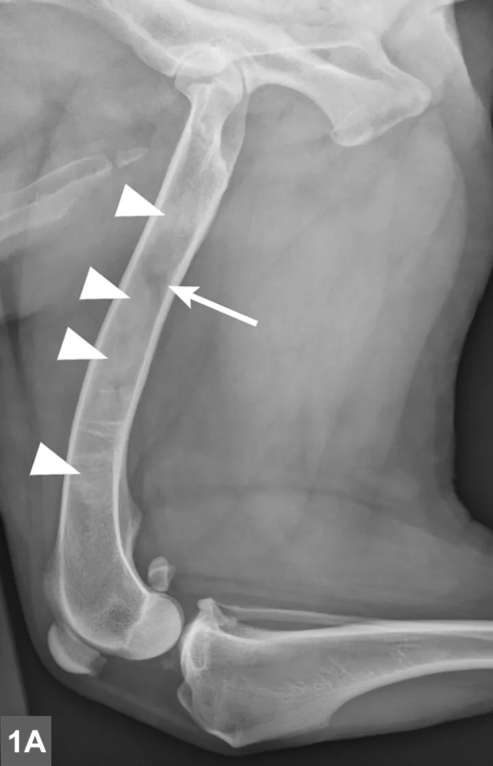 Lateral radiographic projections of the femur (A) and ulna (B, next slide) in dogs with early signs of panosteitis. Note the radiolucency around the nutrient foramen (arrows) and increased opacity within the medullary canal (arrowheads) in both cases.