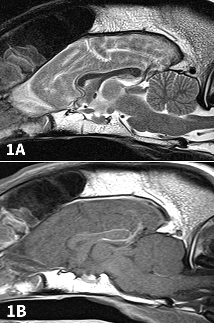 T2-weighted sagittal (A) and contrast-enhanced T1-weighted sagittal (B) MRI scans of a normal dog.
