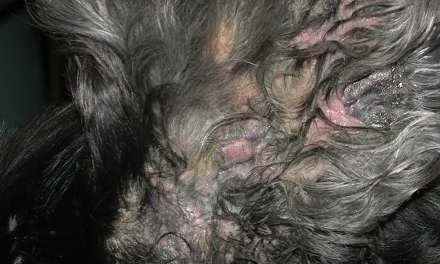 The ear canal is swollen, ulcerated (Figure 2), and uncomfortable with malodorous, often hemorrhagic yellow/green mucopurulent discharge.