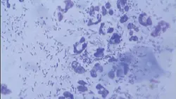 P aeruginosa appears as rod-shaped organisms, typically accompanied by degenerate neutrophils (Figure 3).