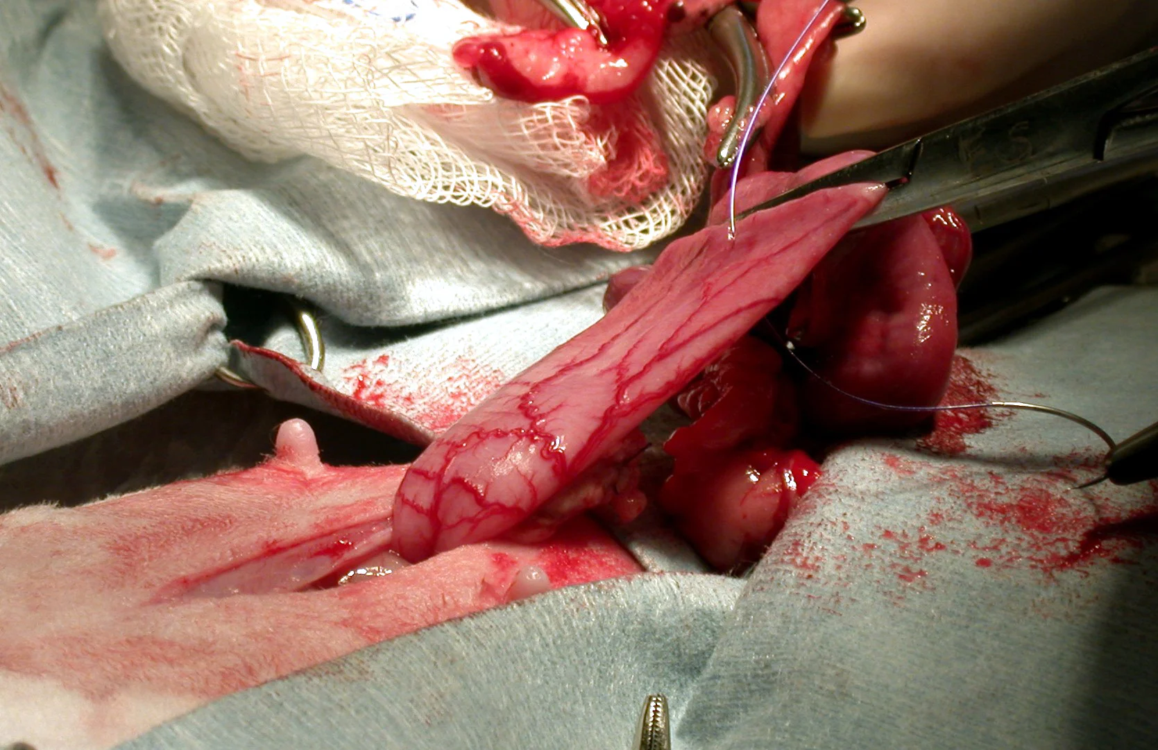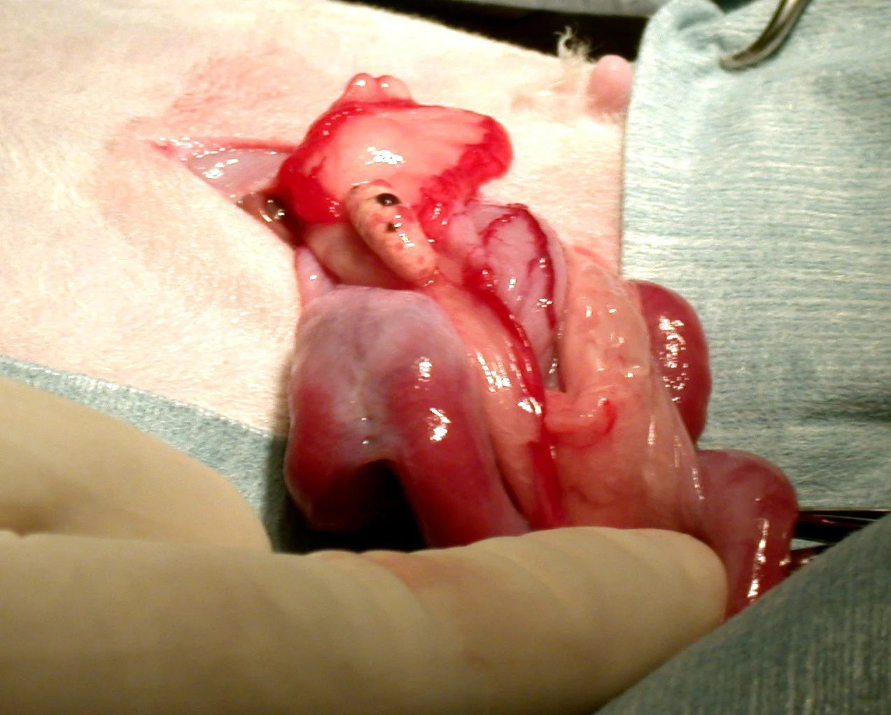 Once the linea alba has been incised, the uterus is usually quite easy to locate ventrally in the peritoneal cavity. If it is not easily seen, simply find the bladder caudally, reflect it ventrally to locate the uterus, and trace this cranially. Do not use spay hooks in rabbits, as they can easily snare the delicate colonic or cecal tissue and lead to adhesions or septic peritonitis. Once the uterus is located, gently retract it out of the peritoneal cavity. The uterus shown is affected by adenocarcinoma with resulting hydrometra. The normal uterus is usually uniform in shape and size and similar in appearance grossly to a cat's uterus, with no assymetrical masses or hemorrhages on the serosal surface, as is seen with uterine adenocarcinoma.