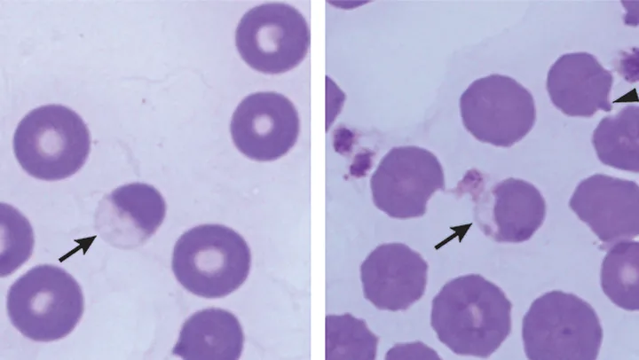 Blood film from a dog. This dog has a Heinz body (arrowheads) hemolytic anemia caused by eating fried onions. Ghost cells (arrows) are erythrocyte membranes that have lost their hemoglobin via hemolysis; their presence indicates that hemolysis occurred before blood film preparation (either intravascular or in vitro). The ghost cells shown here also contain red-staining Heinz bodies. Modified Wright’s stain,1000×