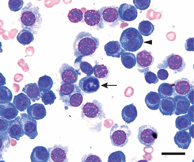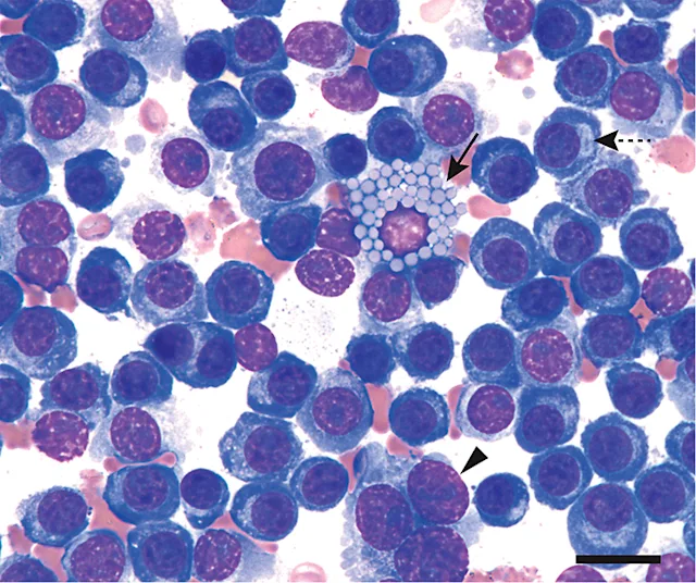 Cytologic smears showed high nucleated cellularity with excellent cell preservation. Nucleated cells consisted primarily of round cells arranged both individually and in large aggregates. Nuclei were round and eccentrically placed and had finely-stippled-to-coarse chromatin patterns; 1 to 2 prominent, round, small nucleoli were present. Cytoplasm was deep blue and moderate in amount and often exhibited a prominent, pale Golgi zone. Occasional binucleated and rare multinucleated (3+) cells were seen. Anisocytosis and anisokaryosis were mild-to-occasionally moderate. Rare mitotic figures (round in shape; high density of long, purple structures [consistent with chromosomes] arranged in aggregates) were observed.