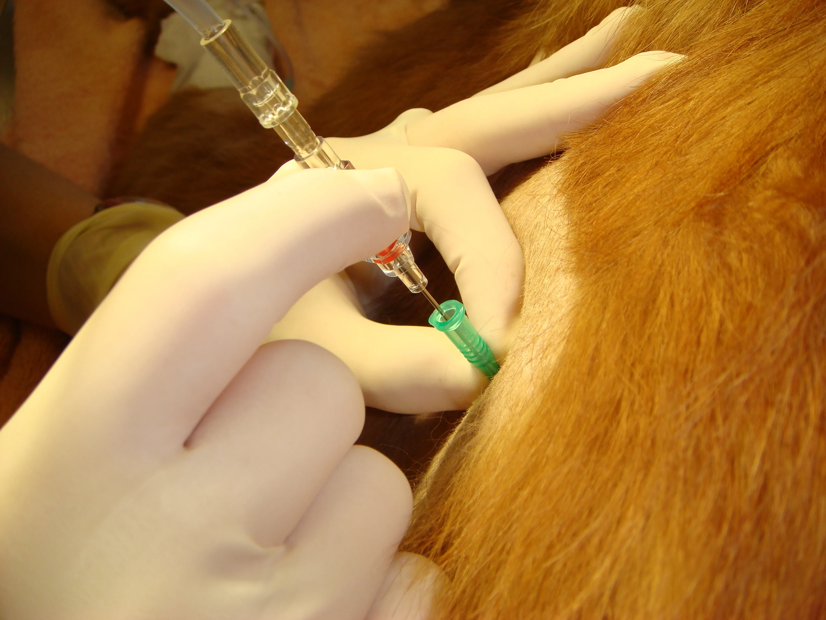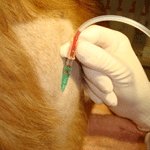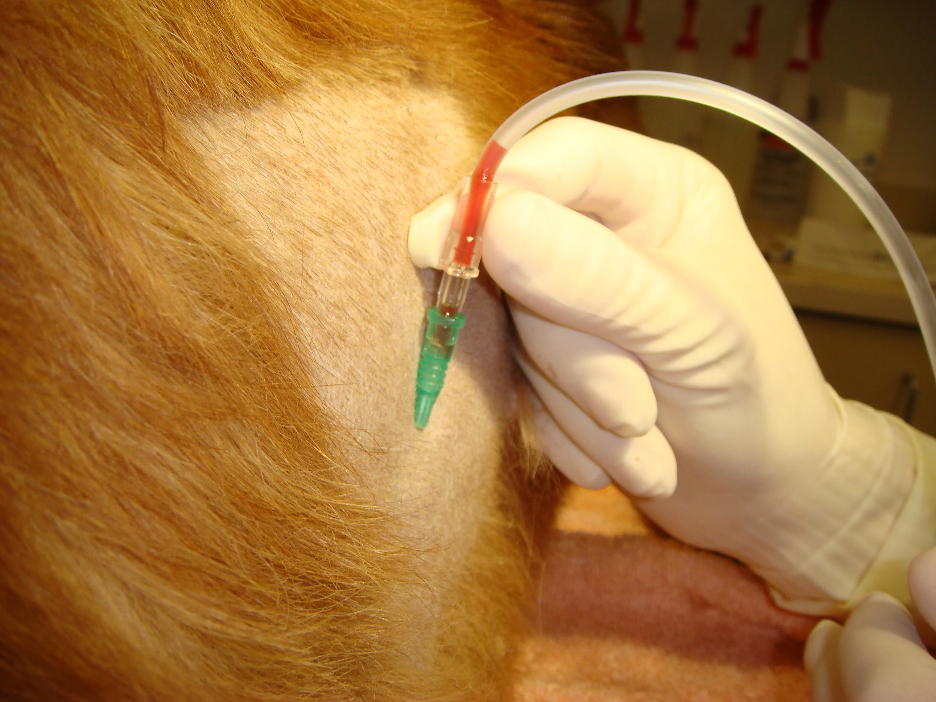 Medium or larger dogs: 20- to 22-gauge 1.5- to 2.5-inch needle attached to an extension set, 3-way stopcock, 3-ml syringe, and 12- to 20-ml syringe