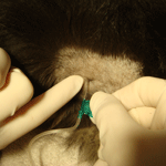 Selecting the appropriate length and gauge needle attached to a syringe, draw up the necessary amount of lidocaine based on the patient's size (2 to 8 mg/kg maximum total infiltrative dose; 0.2 ml of 2% lidocaine should be more than sufficient for an average-sized cat and the maximum feline dose should not exceed 2 mg/kg).
