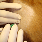 Grasp the appropriate collection set and rest part of your hand or several fingers against the animal's lateral thoracic wall. This will help stabilize your hand in the event of sudden patient movement and decrease the incidence of iatrogenic trauma to the underlying lung.