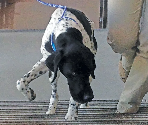 Contracture of the infraspinatus muscle is most commonly seen in medium- and large-breed hunting dogs.11-14 Patients frequently have an initial forelimb lameness associated with an acute strain that resolves over several weeks. A characteristic forelimb gait abnormality then develops as the muscle irreversibly contracts.11-14 Because the infraspinatus muscle runs from the infraspinous fossa to the lateral aspect of the greater tubercle of the humerus, contracture results in the inability to extend the shoulder completely, and the limb is externally rotated and held in an abducted position.11-14 When walking, the limb is circumducted with the elbow partially flexed. This unique gait abnormality is easily observed when the patient walks up or down stairs (Figure 7). Surgical treatment is required and consists of a partial tenectomy of the infraspinatus muscle, which results in immediate improvement in gait abnormality and provides an excellent prognosis.11-14