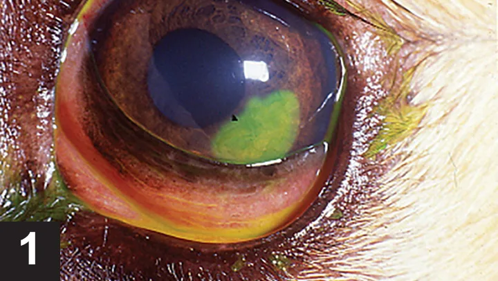 Corneal ulcers are classified by underlying cause. Common causes of corneal ulcerations include trauma (foreign bodies, scratches), desiccation (keratoconjunctivitis sicca, lagophthalmos), or eyelid abnormalities (eyelid masses, distichiasis, or ectopic cilia). Recognition of the primary cause is important; if not treated effectively, progression or recurrence of corneal ulceration is likely. Diagnosis of corneal ulceration can be made by evaluation of clinical signs and a positive fluorescein stain test (Figure 1).