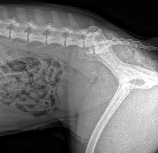 Right lateral radiograph of a dog demonstrating L7 fracture. Images courtesy of Dr Tammy Stevenson.