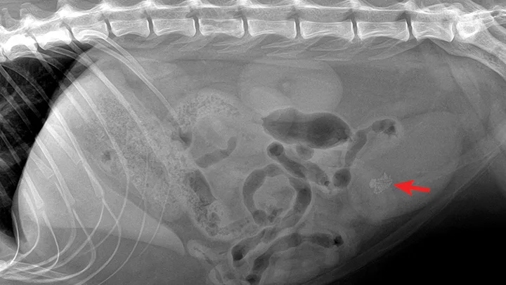 Once the obstruction has been cleared, additional diagnostic tests may be performed (eg, urinalysis, urine culture, abdominal radiography and/or ultrasonography) to investigate underlying conditions and identify bladder stones and neoplasms. (See Figure 2.) In patients requiring urinary surgery, the urinary catheter is often left in place until the procedure has been performed.