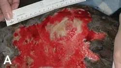 Change the bandage q2–3days. In this dog with a Clostridium tertium abscess at a dorsal scapular injection site (A), 2 days of VAC therapy decreased the size of the wound by about 30% (B) and reduced the amount of necrotic tissue present.