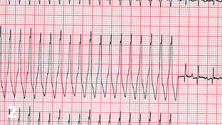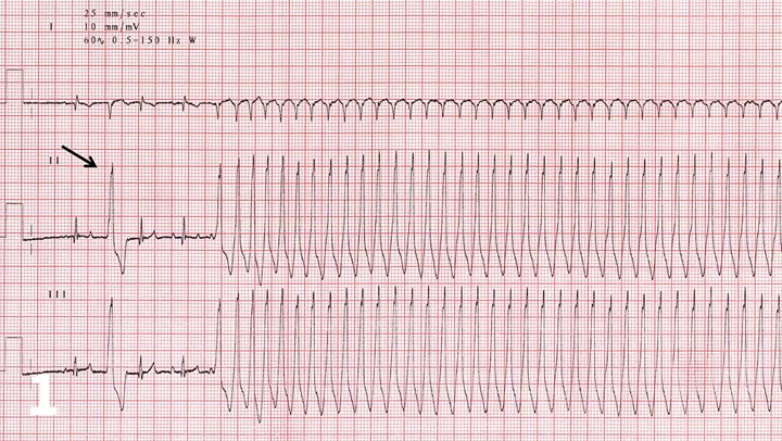 Figure 1 A 3-lead ECG (paper speed, 25 mm/sec; sensitivity, 10 mm/mV) demonstrating a single VPC (arrow) followed by 2 sinus complexes, then an abrupt onset of rapid monomorphic ventricular tachycardia