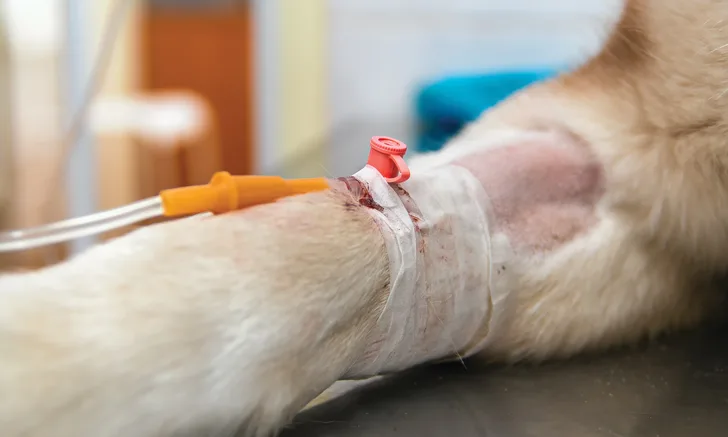 Max was stabilized with crystalloid fluid boluses (lactated Ringer’s solution [total, 40 mL/kg IV]), followed by a colloid bolus (6% hydroxyethyl starch in sodium chloride [5 mL/kg IV]) administered over 20 minutes. Of note, the use of synthetic colloids is controversial in humans with sepsis due to increased risk for acute kidney injury. Two 25% dextrose boluses (1 mL/kg IV) were also administered to help treat hypoglycemia. Broad-spectrum antibiotic therapy (ie, ampicillin/sulbactam [30 mg/kg IV], enrofloxacin [10 mg/kg IV]) was initiated within an hour of admission, and oxygen supplementation (100 mL/kg/min increased to a maximum of 4-5 L/min) was provided via nasal cannula.