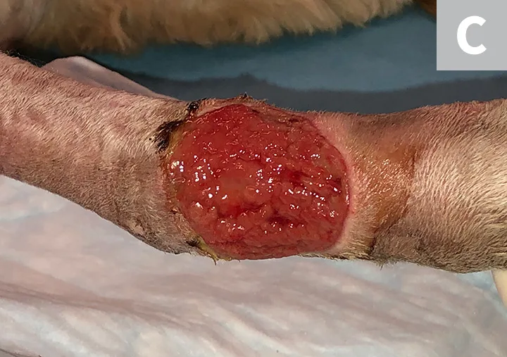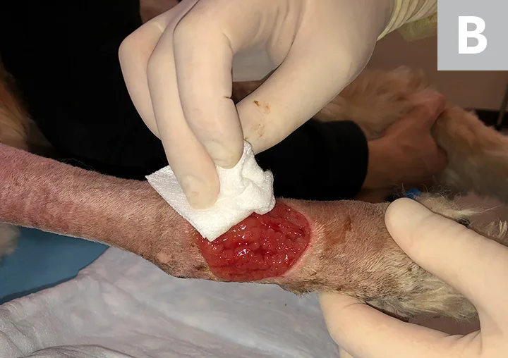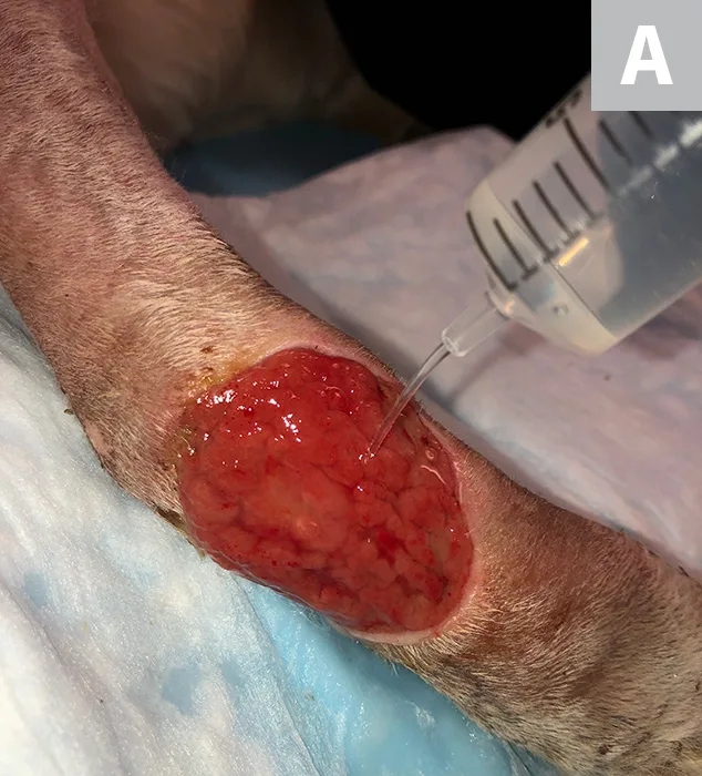Irrigate the wound with sterile saline (A). Debride any existing necrotic tissue. Then, using gauze, remove excess saline from the site (B), leaving a clean wound bed devoid of pus, debris, or necrotic tissue for sampling (C). If possible, let the site dry for ≈1 minute.